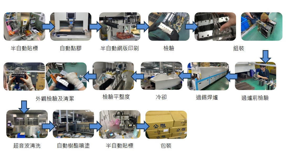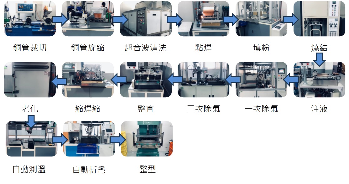 整合廠內製程,打造一條龍式生產模式,從熱導管製造、焊接到組裝皆可在廠內一站式完成。為提升品質,廠內配置多種精密量測與可靠度測試設備,確保產品穩定性,並提供客戶完整的出貨資訊。